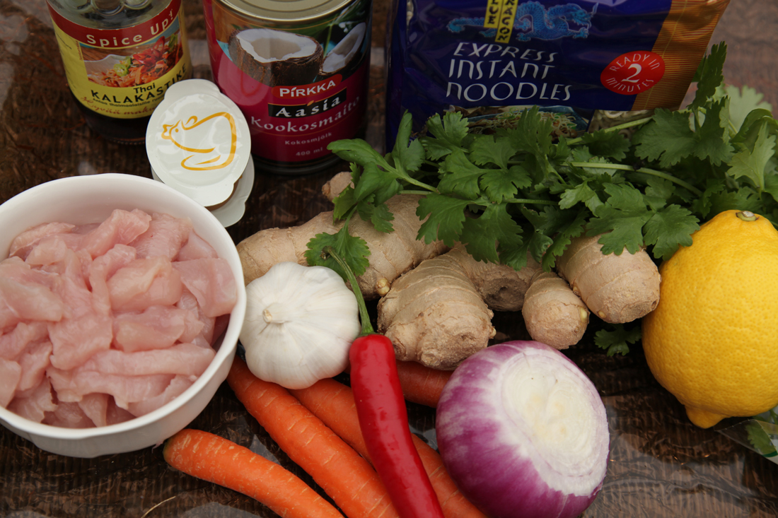 Kiehauta kanaliemi ja kookosmaito, ja mausta suolalla sekä sokerilla. Lisää kiehuvaan liemeen punasipuli- ja porkkanasuikaleet, sekä chili, valkosipuli ja inkivääri. Lisää sitruunan mehu sekä kalakastike. Keitä muutama minuutti ja lisää broilersuikaleet. Keitä miedolla lämmöllä kunnes broileri on kypsää. Lisää nuudelit keittoon ja keitä muutama minuutti. Ripottele päälle korianteria. (kuvat suurenevat klikkaamalla)