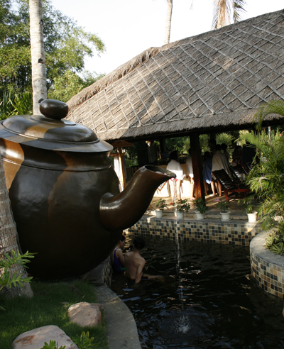 Kuumia lähteitä ja altaita Hainanin saaren vesipuisto-kylpyläalueella oli jos jonkinlaisia. Teevesiallas, ruusuvesiallas, kookosöljyallas, maitoallas, hunaja-allas jne. Alue oli hieno, uintiinkin oli mahdollisuus.