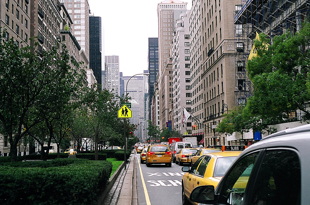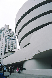 Keskiviikon oli tarkoitus olla Suuri Shoppailupäivä, mutta sain lyhyen aamupalaverin aikana suostutelluksi, että käytäisiin kunnon aamiaisella Brooklyn Bagelissa ja Tompan kanssa voitaisiin ostaa vähän nettiaikaa sähköposteilua varten (kymmenen minuuttia maksoi kaksi dollaria) ja sitten voitaisiinko, jooko, eikö, pliis, käväistä äkkiä Guggenheimin museossa? Ja sehän sopi! Nämä ihmiset ovat oppineet reissaamaan kanssani ;)… Siis taas taksi: tällä kertaa mentiin Up Towniin Central Parkin reunalle Park Avenueta pitkin (tässä taustalla, huom. keltaisten cabien määrä). Aamuruuhkassa aikaa kului puolisen tuntia, mutta nähtiin siinä samalla ”kaikki” Guccit, Versacet, Armanit, Gantit, Ralph Laurenit … ja tuli oikein edulliseksi tutustua niihin taksin ikkunasta. Oli muuten reissumme ainoa taksi, joka ei ollut Ford Crown Victoria (sellaisia ne yleensä täällä ovat) vaan Toyotan joku tila-auto, josta oli kiva katsella aamukiireistä New Yorkia. Erityisesti katselin rullaluistelijoita, jotka autojen ja jalankulkijoiden välissä sujahtelivat kuin ei mitään! Jotain aivan toista kuin Pikisaaren tai Niittyaron autiot pyörätiet, joilla minä sunnuntaiaamuisin mieluusti aikaani rullistellen vietän.