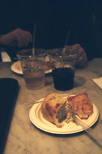 Lounaaksi lapset päättivät nauttia jotain tosi aitoa nykkiläistä: Bretzelit ja cokista kadunkulman kärryistä. Kärryjä oli melkein joka kadunkulmassa, hot dogit ovat kai perinteisimpiä niiden valikoimassa, mutta bagelit ja muffinsit näyttivät myös kuuluvan myytäviin tuotteisiin. Me Pekan kanssa yritimme Rockefeller Centerin Wine Shopin lounaalle, mutta kun sinne ei mahtunut, menimme naapuriin: Dean & Delucan Deliin, jossa pääsimme jälleen todistamaan amerikkalaista kulttuuria: paperi/pahviroskakulttuuria. Nautimme herkullista foccacciaa (rosmariinileipää) ja peruna/parsakaalipiirakkaa ja niiden kera talon omia pulloteita, kalifornialaista chardonnayta ja merlotia. Niin ruoka kuin viinitkin olivat herkullisia, MUTTA ne tarjottiin pahvin, paperin ja kertakäyttötyökalujen kanssa. Ja viinit kaadettiin muovimukeihin, joissa oli kannet ja pillit, ihan kuin hampurilaispaikoissa cokisten tarjoilussa. Äh!