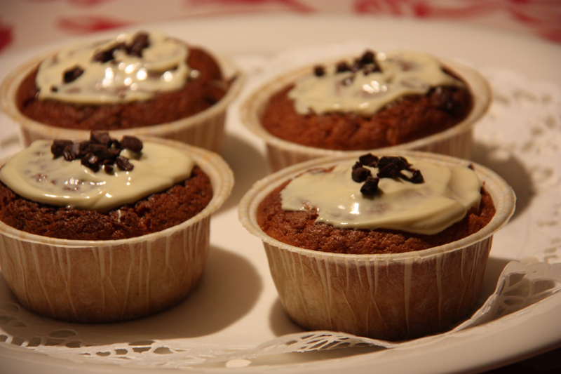 Reissutuliaisia on myös kimpale valkosuklaata, jonka ostin Whole Foodsista. Ammattilaisten Callebaut-suklaa oli NYCissä edullista ja se on aika ainutlaatuista. Siitä (osasta) tein muffinseja. Ei mitään dieettiruokaa, mutta ah, kuinka suklaarouhesattumat mehevässä muffinsissa maistuvatkaan taivaalliselta. Toki tämän voi tehdä Fazerin leivontavalkosuklaastakin, hyvää tulee varmasti siitäkin. (Resepti suurenee klikkaamalla.)