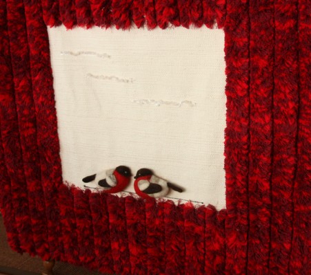 Sitten takaisin Aleksis Kiven kadulle. Ja siinä se on! Meidän mökillä on seinä, johon olen pari vuotta etsinyt ”jotain”: ryijyä, taulua, huovutustyötä, jotain … Olen kiertänyt Saariselän ja Napapiirin Joulupukin kylän matkamuistomyymälät, käsityömessut ja eräänkin muun putiikin ja puodin, mutta  mitään sopivaa ei ole kohdalle kolahtanut. Mutta siinä se nyt on: Tampereella Aleksis Kiven kadulla olevan Sokeain Aitan ikkunassa on meidän mökin seinälle juttu. Ostimme pois.