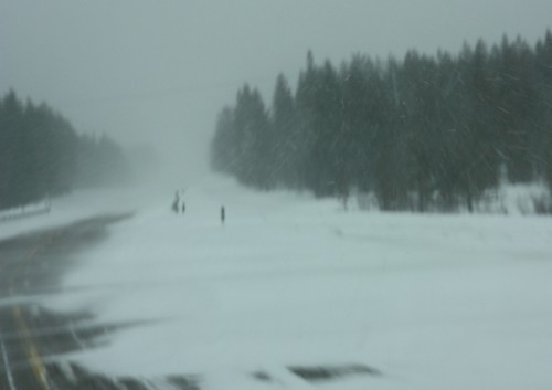 Sodankylässä kävin tankilla, kahvilla, soittelin kotiin ja taas matka jatkui. Tuuli idästä yltyi kovaksi, aina metsästä aukealle tullessa oli muistettava pitää ohjauksesta tiukasti kiinni: tuuli puski kovasti. Vajukosken kohdalla tie kapeni yhden auton mentäväksi: lumi pyrysi penkoista tielle, kinosti ja nietosti. Just ja just uskalsi ajaa kuuttakymppiä (kesäkelillä niillä hujakoin mennään kaksikertaa kovempaa).