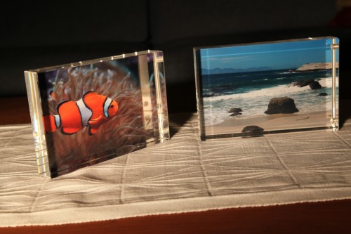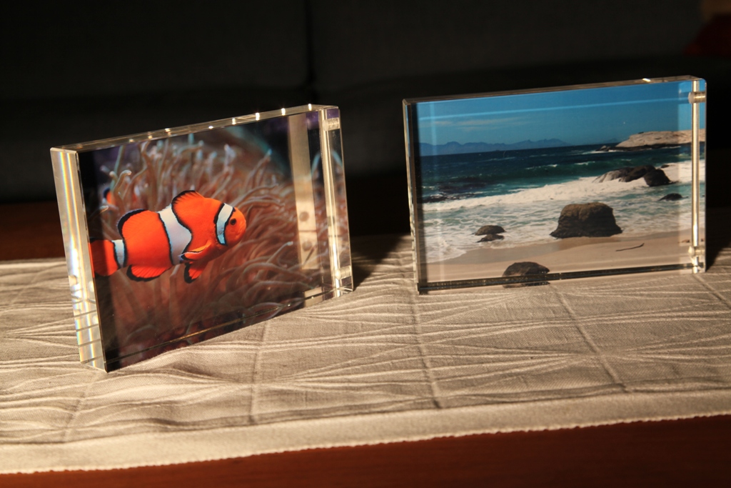 Ostin Lissabonista perjantaina kaksi akryylistä valokuvakehystä. Ajattelin, että saattavat olla aika mukavat ja kätevät. Ja ovathan ne! Tulostin toiseen fisun kuvan Lissabonin jättiakvaarioista ja toiseen kuvan Etelä-Afrikan rannikolta Boundary Islandilta, jossa olimme katselemassa pinguja. Kehyksessä on metallitausta ja paksujen akryylimötiköiden pohjassa magneetit.