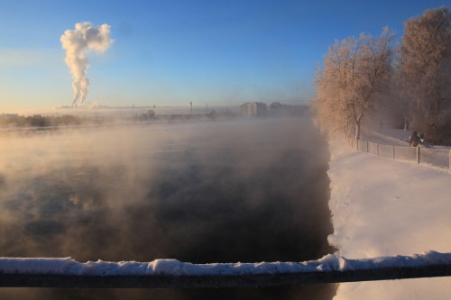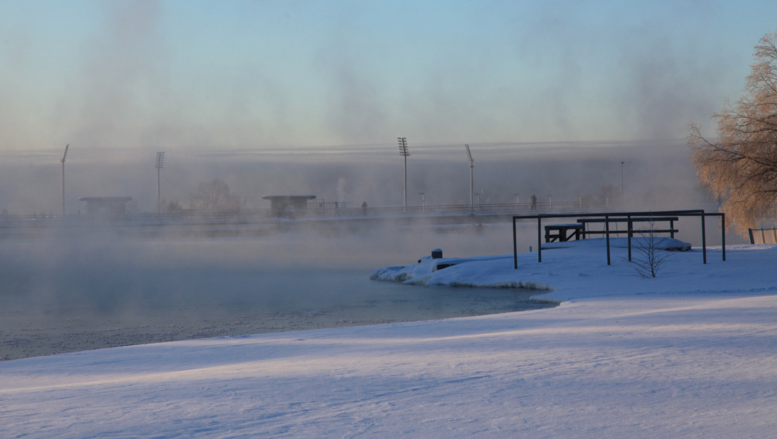 Sen kuukauden kuvasarjan voisin tietysti aloittaa. Kuvanhan sitä varten otin jo viime viikonloppuna. Olen päättänyt, että otan tänä vuonna, joka kuukausi kuvan patosillalta Merikosken voimalaitokseen päin. Minun opiskelu/työmatkani kulki Toivoniemestä Patosillan ja Hupisaarten kautta Kasarmintielle (valehtelematta varmaan yksi kauneimpia reittejä, joita Oulussa voi olla) puolenkymmentä vuotta, ja opin katselemaan tuota näkymää vuodenaikojen rytmissä – ihaillen jo silloin. Tulevan kuukauden kuvan kuvauspaikka on alle kilometrin siitä, mistä viime vuonna otin Puutteenperä-kuvia.