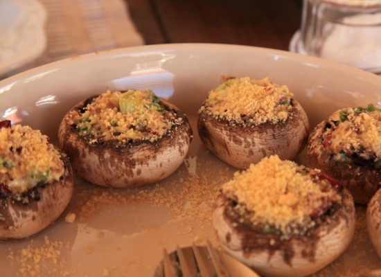 Pilko jalat, silppua poro lastuiksi, pilko purjo ja sekoita niistä juuston ja rouhitun pippurin kanssa tasainen tahna, jolla täytät sienet. Laita sienten päälle juustoraastetta ja pistä kuumaan uuniin noin 10 minuutiksi. Tai grillaa. Siinä koko monimutkainen ja makoisa juttu.