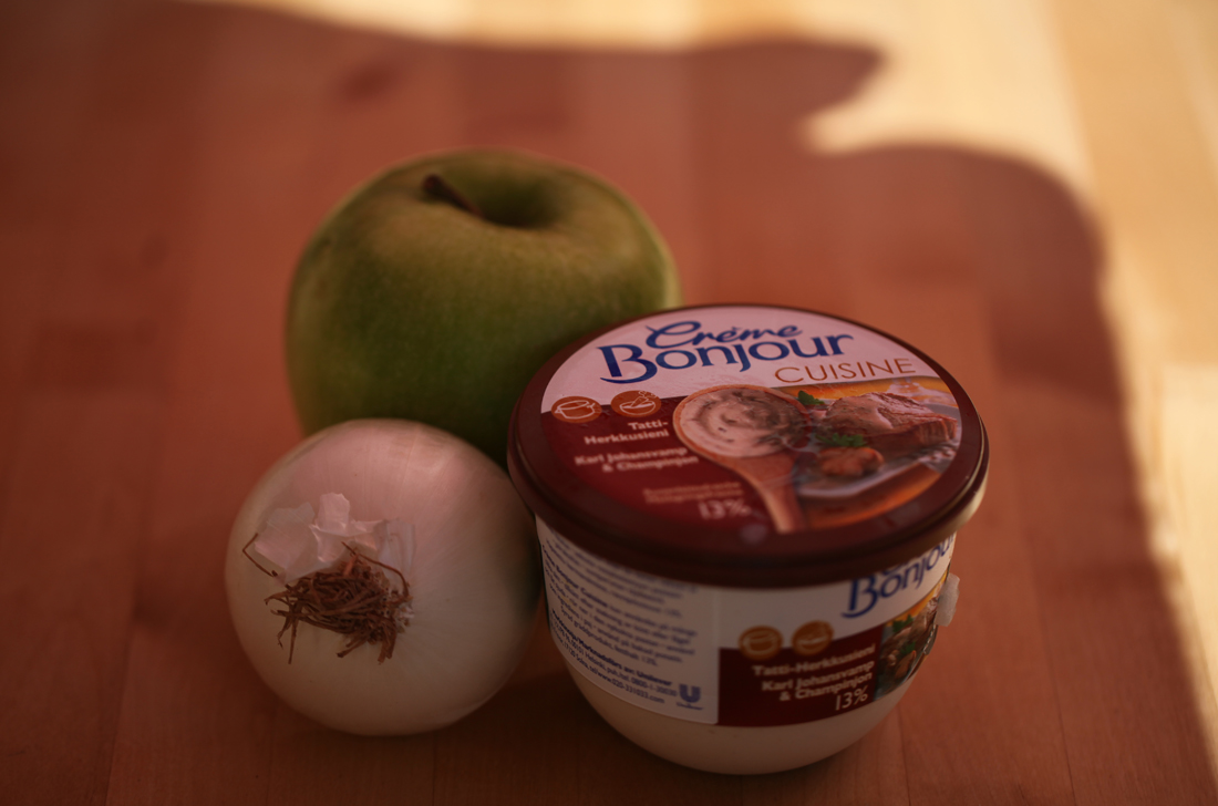 Kuvassa ainekset (kahden hengen annokseen 1 omppu ja 1 sipuli)