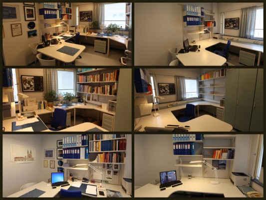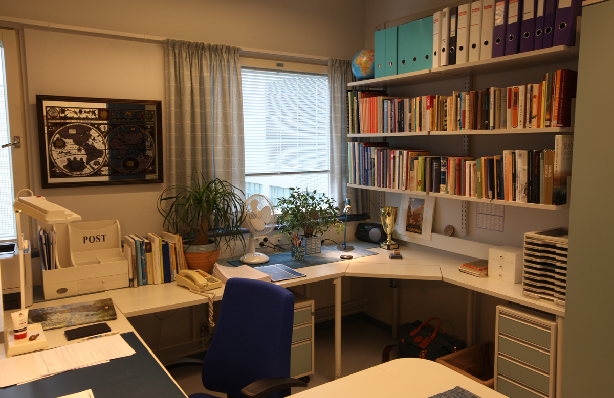 Siitä on melkein 18 vuotta kun menin kampukselle, lapset aloittivat tarhauran ja minä jatkoin äitiysloman (ja kotihoitojakson) keskeyttämää amanuenssin uraani. Olen ollut melkein koko ajan samassa työhuoneessa. Kirjastossa olin vähän aikaa tutkijankammiossa, samoin naapurikäytävällä ja sitten yhdessä välissä olin hissan laitoksella vuoden ”Maailmanhistorian laboratoriossa” (= kahden tutkijan yhteishuone)  –  silloin apurahakaudella väikkärinteossa. Mutta joka tapauksessa minulla on ollut rutosti aikaa kerätä pöydille, seinille ja hyllyihin kirjoja, papereita, mappeja, diplomeja, astioita(!), kukkia, tauluja (karttapeilitaulua ei voinut ottaa pois; seinässä kamalat jäljet, kiinteistöhuoltoon ei saa kertoa), liinoja, muistivihkoja, laatikoittain muistiinpanoja,  lamppuja, joulukynttelikkö, karttaputkia, karttoja …