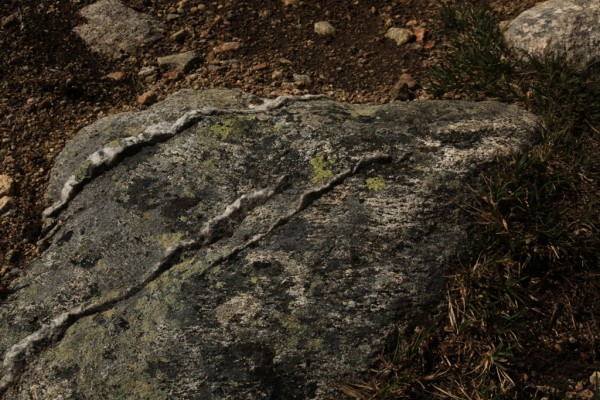 Tunturin huipun puuceen edessä on kivi, jossa on näin hienot ”kerrokset”.