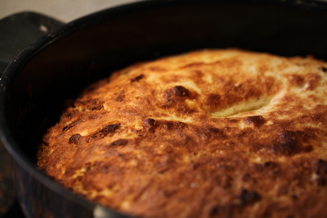 Tästä versiosta tuli aika paksu. Jos sen tekisi kokonaan uunissa ja uunipannulla niin lopputulos olisi varmasti ”oikean” paksuinen (ks. kuva eilisessä postauksessa). Mutta olisiko maku sama, jollei ensin paistaisi liedellä? Hyvää tämä tanakampikin versio oli…