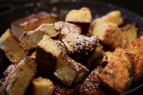 Tällä pannukakulla on monta syntytarinaa, ja vielä enemmän reseptiversioita. Minä poimin yhden netistä, ja jätin rusinat pois, vähensin voin määrän kolmannekseen (ehkä vähän vaikutti makuun, mutta säästi myös kaloreissa), laitoin vähän enemmän munia. Nautimme kolmestaan noin puolet valmiista Kaiserschmarrenista, joten ohje lienee sopiva sopiva kuudelle. Jos poika olisi ollut kotona olisi pannari huvennut kokonaan. Junioria olikin nyt ikävä, oli kuitenkin vähän kuin juhlapäivä …