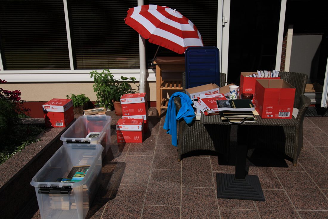 Aamusella yritin houkutella äitiäni torille, mutta kun ei jaksanut, oli minun väistämättä – vihdoin – pehtoorin eräänkin kerran huomautettua, että autotallissa ”on joku ylimääräinen, purkamaton muuttokuorma” – ryhdyttävä järjestelemään duunista rahtaamiani kirjalaatikoita ja uudelleensijoitettava niitä. Ilahduttavan paljon joukossa oli yliopiston kirjaston kirjoja, voin roudata ne sinne. Puolet kuormasta olen jo aiemmin saanut sijoitettua kirjahyllyihin ja vaatehuoneen uusiin hyllyihin, mutta mihin nämä loput!!! Ja osaa tarvin vielä syksyn kuluessa, joten en voi oikein ”syväjäädyttää” niitä odottamaan paluuta kampukselle. Ei muuta kuin muovisiin rullalaatikoihin ja – osa divarikasseihin – ja muutama roskiinkin. Ja vielä vähän mahtui työhuoneen hyllyihin.