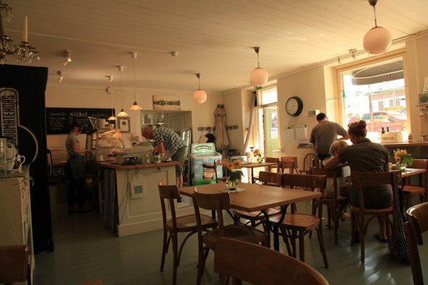 Kristiinankaupungissa oli tarkoitus mennä (Taijen suosittelemaan) Pavikseen, kesäravintola venesatamassa, mutta mokoma oli kiinni. Ei enää ole sesonki. Niinpä sitten palasimme pikkukaupungin, nimenomaan puutalokaupungin keskustaan ja menimme torinreunalla olleeseen vinkel-lounaspaikkaan. Viehättävää pikkukaupungin idylliä siinäkin. Ja lähiruokaa siis suosittiin. Pari suolaista, pari makeaa piirakkaa vitriinissä, luomumehua, Laitilan virvokkeita. Samassa kiinteistössä myös lahja- ja sisustustilpehööriä myynnissä.