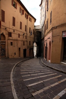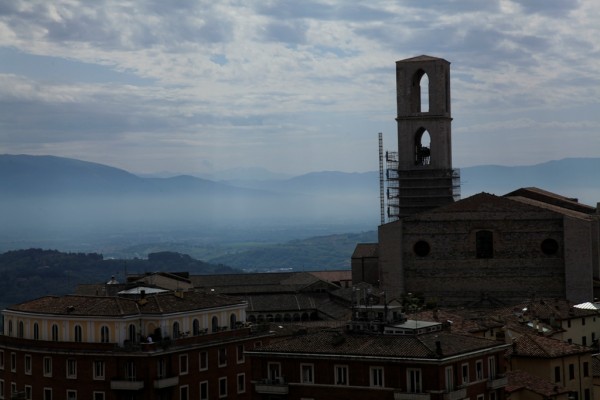 Ja päätimme lähteä ajoissa, ennen mahdollista ukkosta. Perugian rautatieasema käytiin ensin tsekkaamassa: on luultavaa että saamme sinne vielä vastaanotettavia 🙂 ja sitten erinäisten parkkipaikanetsimisvaikeuksien jälkeen pääsimme Perugian kaupunginmuurien sisälle. Hui! Yön sateiden jälkeen vielä kosteaa sinistä ilmassa.—