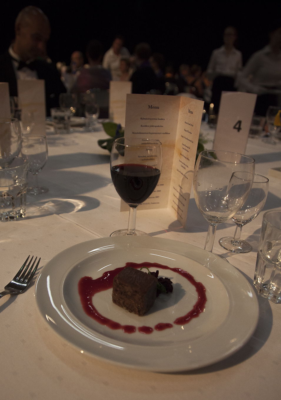 paahdettua sorsaa ja punaviinikastiketta, juustoja, savariini, metsämarjoja ja melbakastiketta, kahvia ja suklaakonvehteja. Miksi minä vertaan koko ajan siihen Oloksen kapituliin kaikkea? … Sen ylittänyttä ei oikein missään suhteessa ole vielä (yhteensä on oltu viidessä kapitulissa) löytynyt. Paitsi että ehkä… Jyväskylässä oli kaikki esitteet, menukortit, osallistujaluettelot, mukava pikku lahja Viinitermit-kirjanen jne. poikkeuksellisen tyylikkäitä ja laadukkaita. Ja sitten sää. Oli niin kaunista ja lämmintä, me saimme ne elokuun samettiset illat, joita olen kaipaillut. …