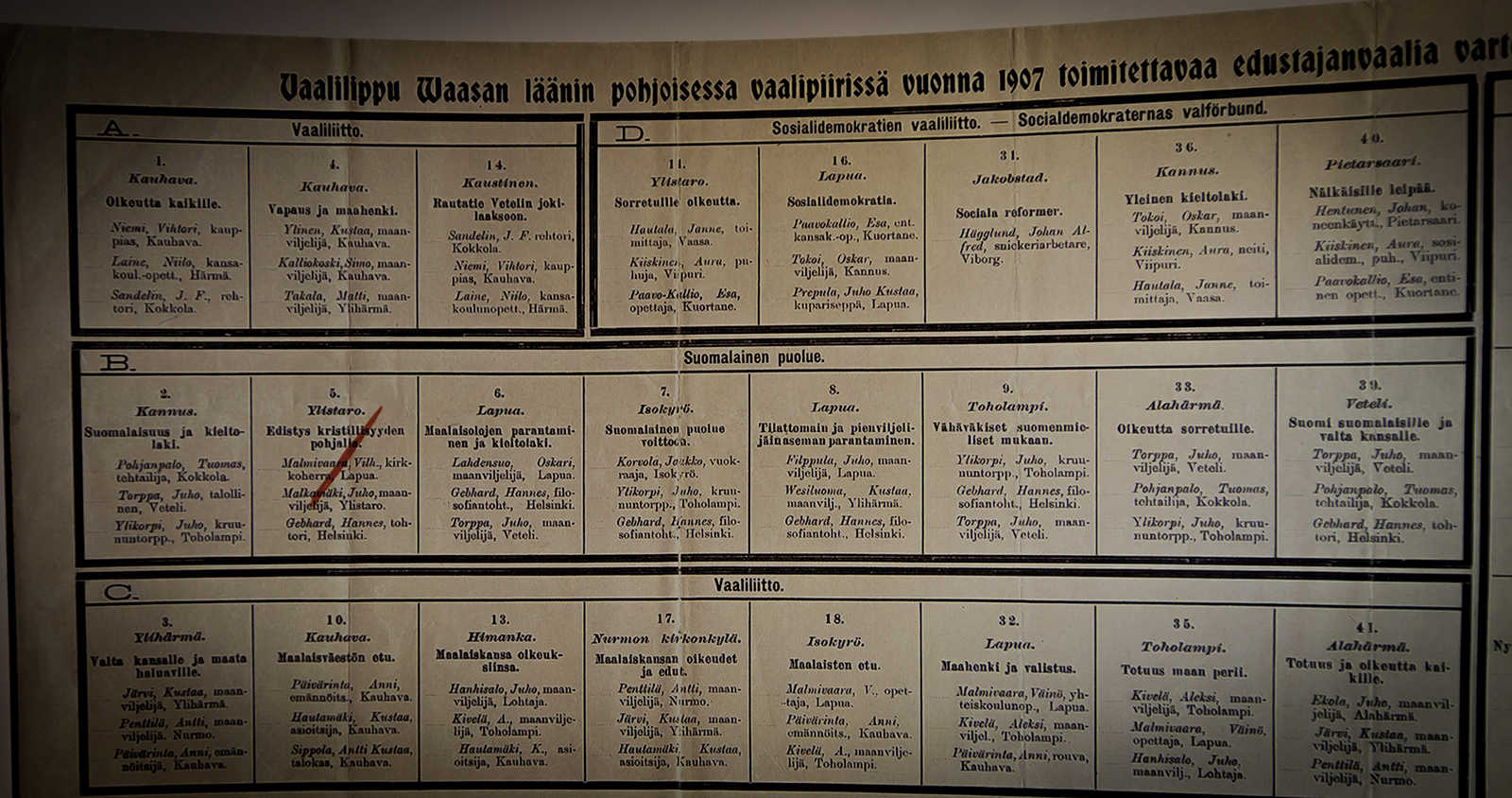 Klikkaamalla tuon alimmaisen kuvan, jossa on siis kopio vaalilipusta, isommaksi näet ehdokasasettulussa mielenkiintoisia juttuja. Ensimmäisissä valtiollisissa vaaleissa Vaasan läänin vaalipiirissä olleet ehdokkaat ovat neljässä vaaliliitossa. Joukossa on vain yksi nainen. Anni Päivärinta vaaliliitto C:n kolmessakin listassa. Kauhavalla hänen nimensä on ensimmäisenä listalla ”Maalaisväestön etu”, Isonkyrön Maalaisten etu -listassa toisena ja Lapualla listalla Maahenki ja valistus -listalla kolmantena. Mitä tämä tarkoittaa?