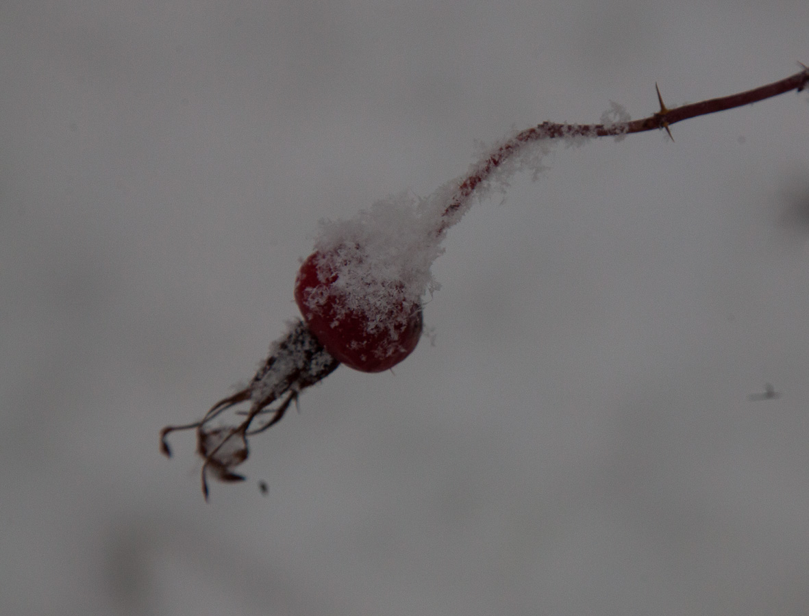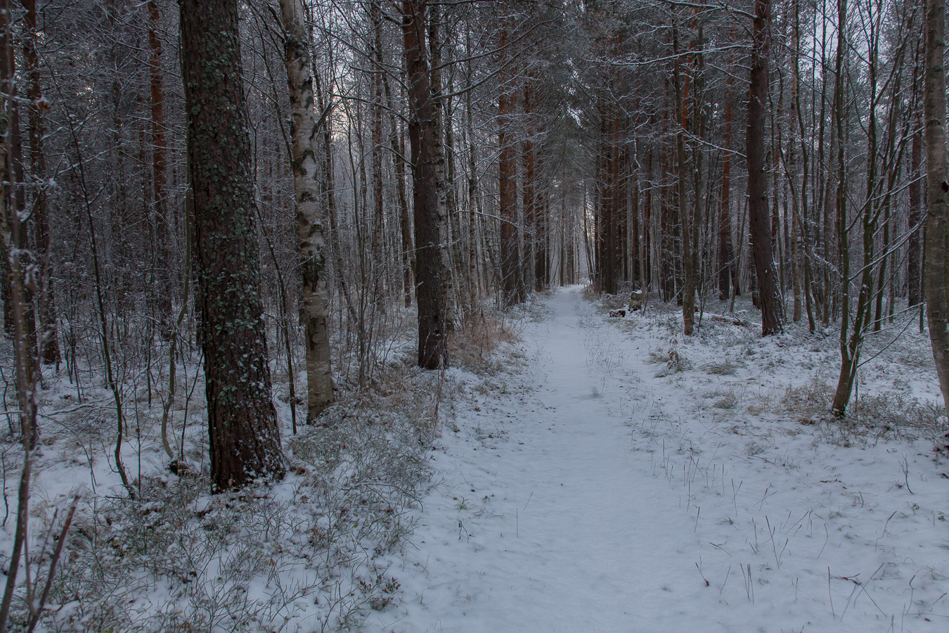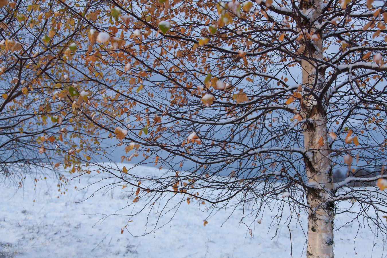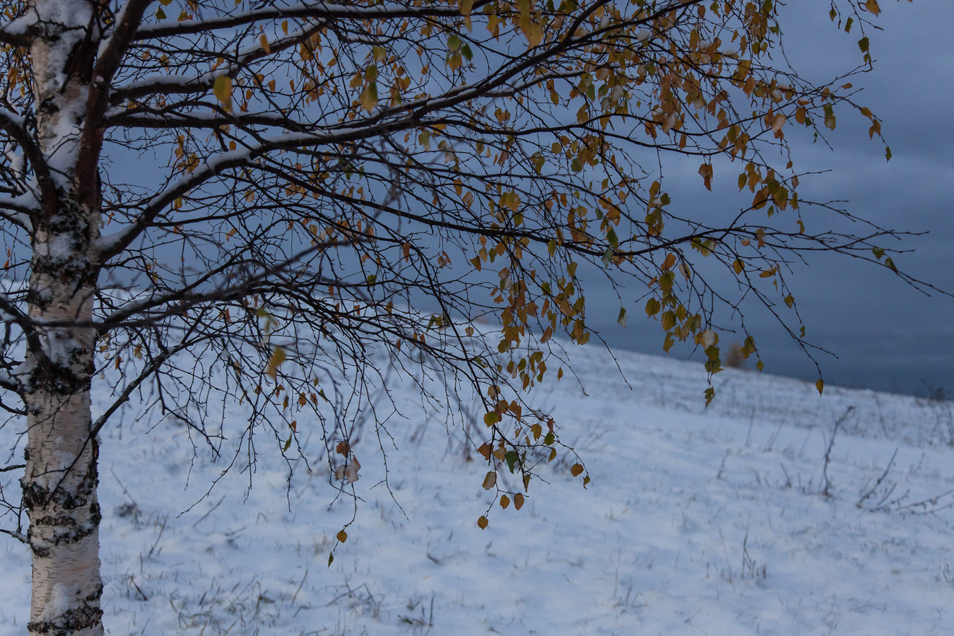 Merkillistä, että lehdet ovat yhtä aikaa keltaiset, kun maassa jo lumi. Taivas tummanpuhuva.