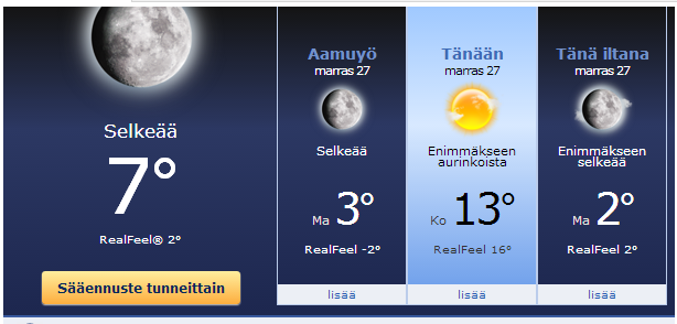 Taas myrskyää. On pimeää. Ei sentään sada. Ja hengenvaarallisen liukasta on. Onneksi ei tarvitse olla tienpäällä.