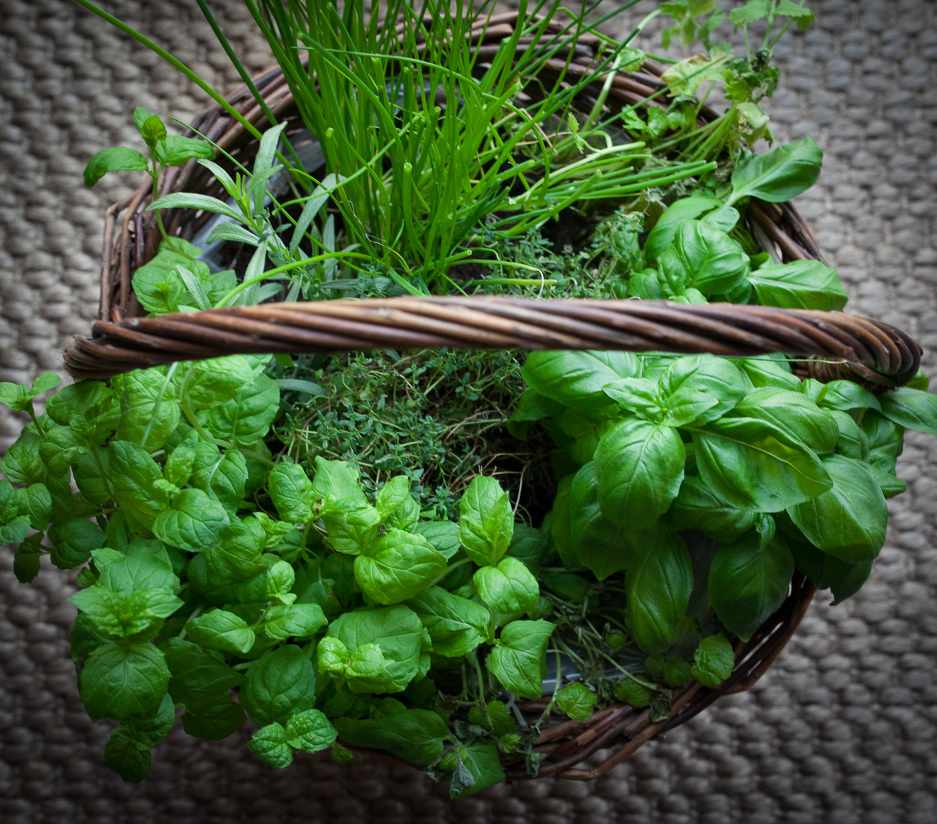 Vielä yksi vinkki: keittiöön kuuluu tämäkin eli iso yrttikori. Joulun kukka-asetelman tyhjennetty kori täyteen yrttimultaa ja siihen istutettuna kaupan pikkuruukkuyrttejä. Säilyvät ja myös kasvavat siten aika paljon paremmin kuin nuutumassa jääkaapissa tai ikkunalaudalla. Kesän tullen voi sitten siirtää suoraan parvekkeelle tai kasvimaalle.