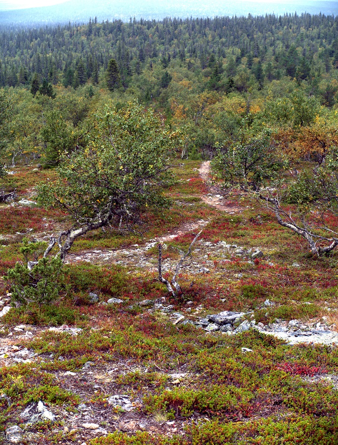 Riekonmarja ja mustikanvarvut ovat jo punaisia… ja satunnaisia keltaisia lehtiä puissakin.