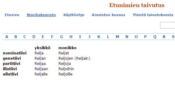 http://kaino.kotus.fi/etunimientaivutus/index.php?s=hakemisto
