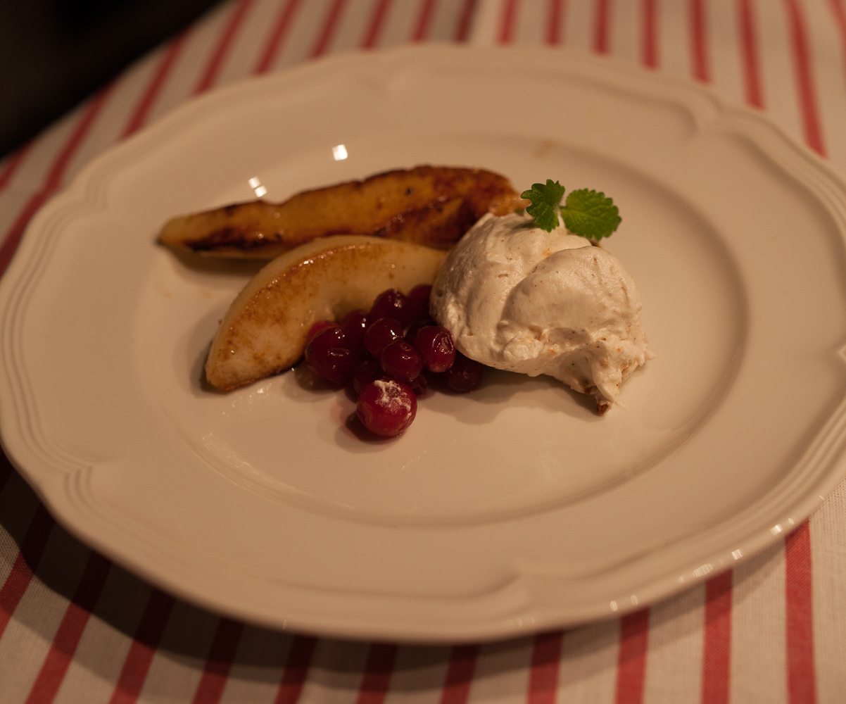 Eikä tänäänkään ruuatta. Soveltelinpa uuden jälkkärinkin. Melkein joulupöytään voisi olla sopiva. Ainakin joku joulukuun pyhäruokailu kannattaa päättää tähän. Karamellisoidut päärynälohkot ja piparkakkurahka. Karpaloitakin löysin mukaan.