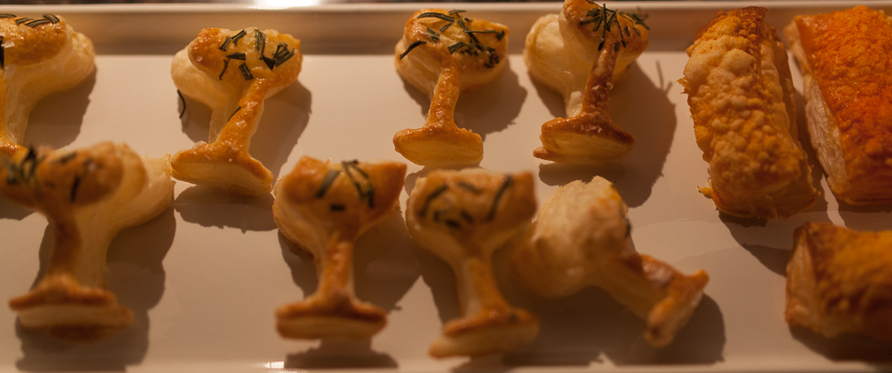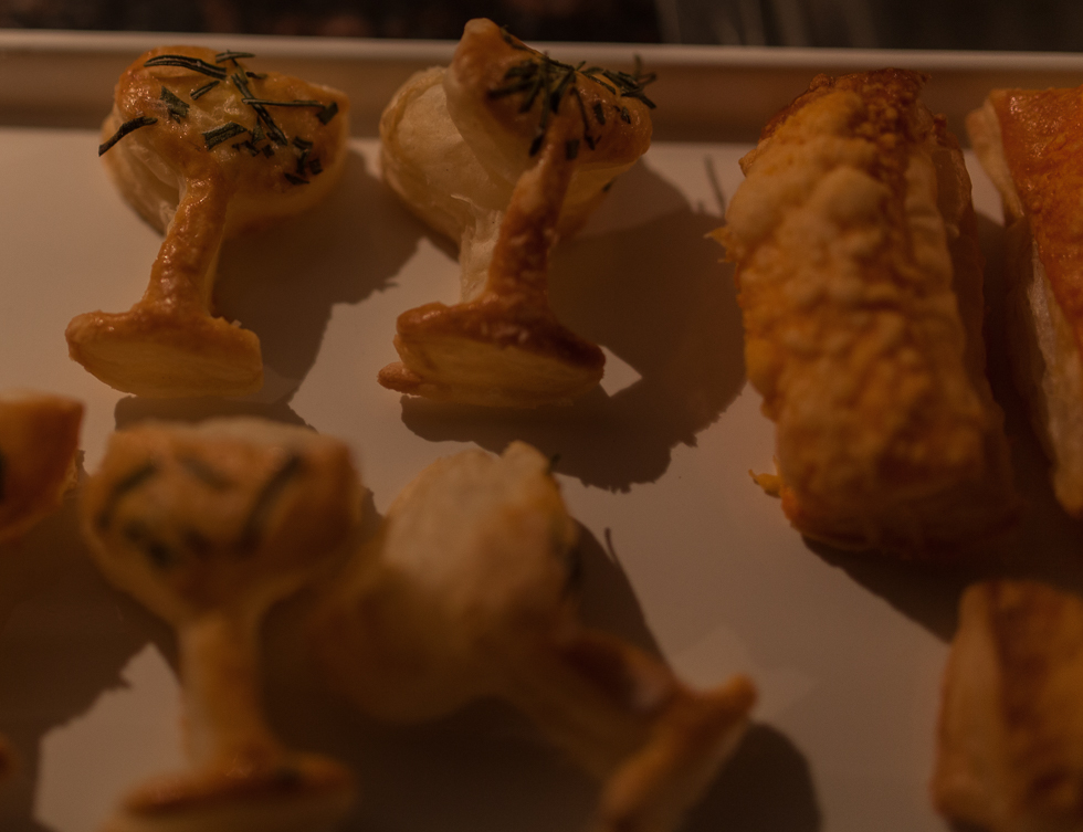 Tein puolikkaasta Myllyn Paras- vai Sunnuntai -lehtitaikinapaketin levyistä viinilasi-muotilla rosmariini-suola-napostelupaloja (voitele munalla, ripottele tuoretta rosmariinia ja maldon-suolaa pinnalle) ja puolikas levyistä kului siihen, kun voitelin munalla viipaleet, sitten sivelin paprikaöljyllä, jonka ystäväni toi kesällä Budapestin matkaltaan, ja sitten lopuksi ripottelin pinnalle mustaleima-emmentalia ja paiston pakkauksen ohjeen mukaan.