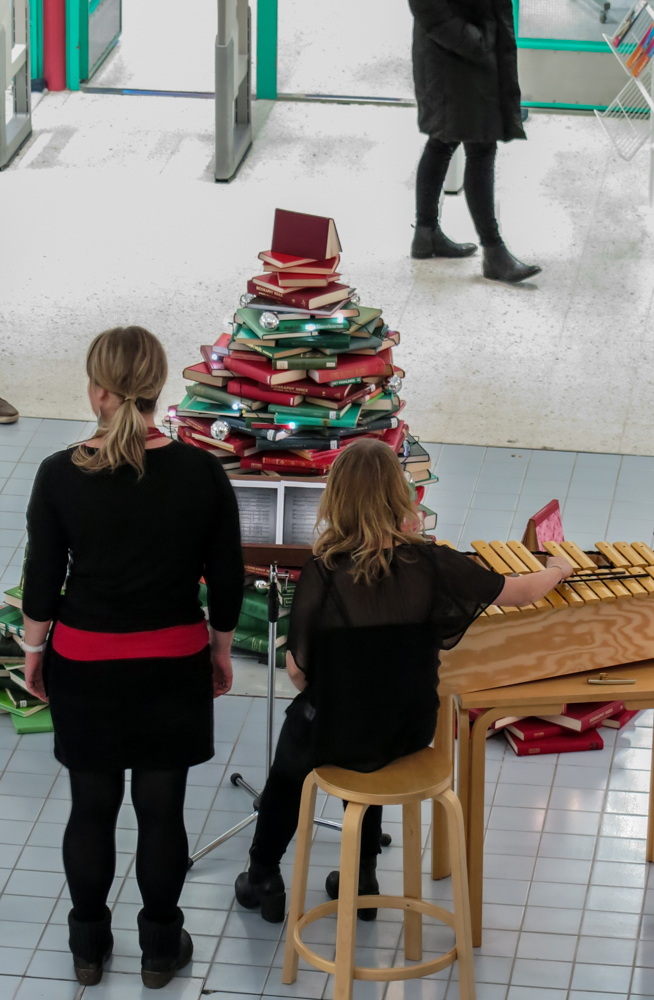 Päivän pitkästä kokouksesta huolimatta ehdin kirjastoonkin; sittenkin artikkelipuuhaan taidan ryhtyä, yrittää ehtiä. Ja kirjastossa joulua.
