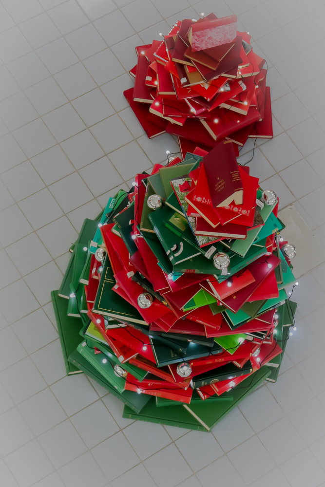 Vihreistä ja punaisista kirjoista koottu joulukuusikirjapuu. Ja vieressä pieni punainen joulupuu.
