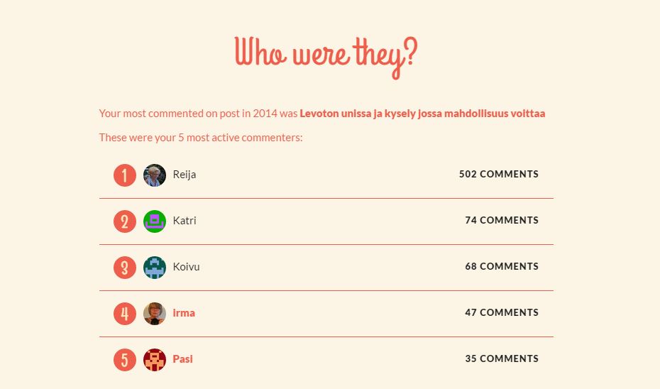 Mutta kuka on vuonna 2014 kommentoinut eniten? Kenelle lähtee kalenteri? Katrille vai Koivulle?