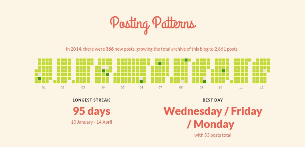 Minun sitoutumisestani tähän bloggaamiseen kertoo, että olen seitsemän vuotta blogannut joka päivä (muutamia kertoja postitus on vierähtynyt puolen yön yli, joten siksi näyttää, että joinakin päivinä olisi ollut kaksi postausta ja joinakin ei yhtään). Nyt postauksia on yhteensä 2661 (+6 tämän vuoden puolella).