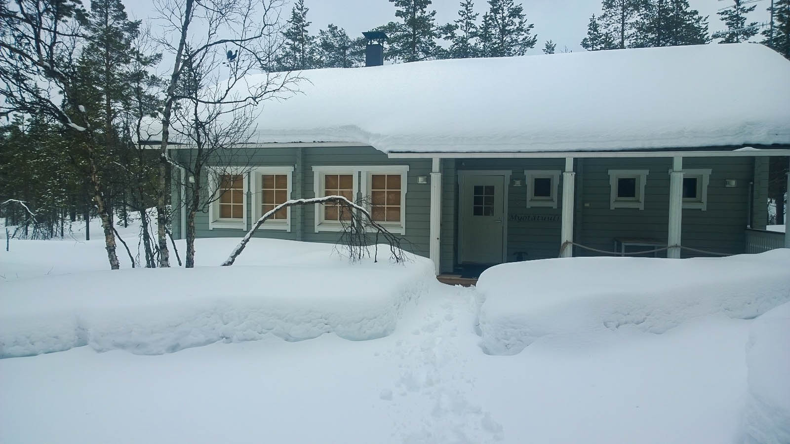 Mökkipihassa lunta. Minullahan jäi viimeksi lähtiessä lumityöt tekemättä… Ja lisää on tullut. Ei ihan metriä, mutta paljon on lunta. Raskasta nuoskalunta. Paljon jäi lumitöitä huomiseksi.