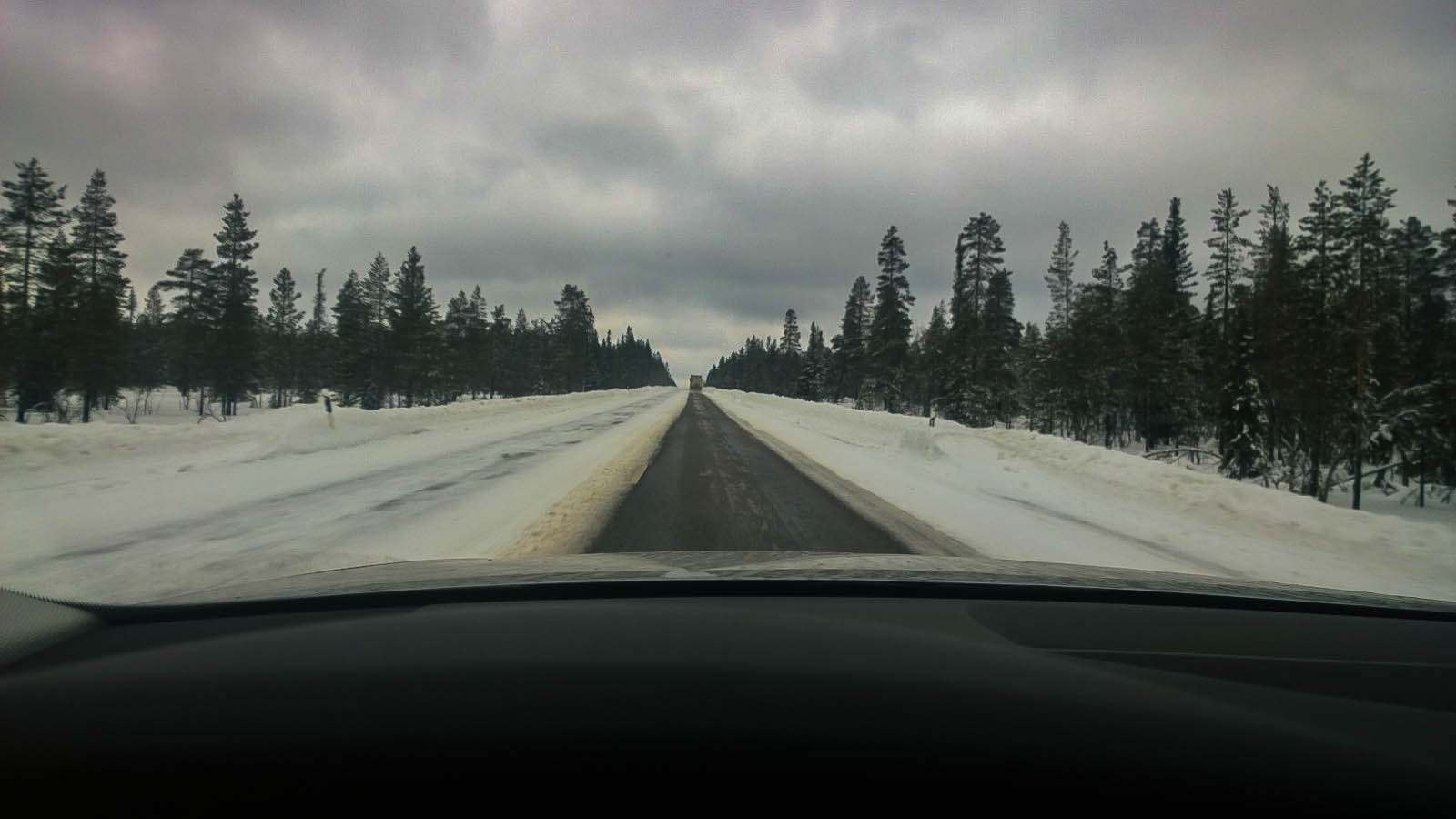 Oli ihan hitonmoinen keli. Vettä, räntää, loskaa, vesisadetta, jäätävää tihkua. Mustaa jäätä, tavallista jäätä, rospuuttoa. Paljon (vastaantulevia) rekkoja, paljon ihan kahjoja ohituksia tekeviä. Palteita, vastaantulevien heittämää vesimoskaa, vesiliirtoa (oikeasti kerran kyllä kylmäsi ja puski hien pintaan oikeasti) … Ei poroja mutta oli ajettava hiljaa. Kuuttakymppiä, vain pieniä pätkiä satasta. Loppumatkasta tie liki kuiva (yläkuva). Matkaan kului (Rovaniemen Sittarin pysähdyksen kanssa) kuusi ja puoli tuntia.