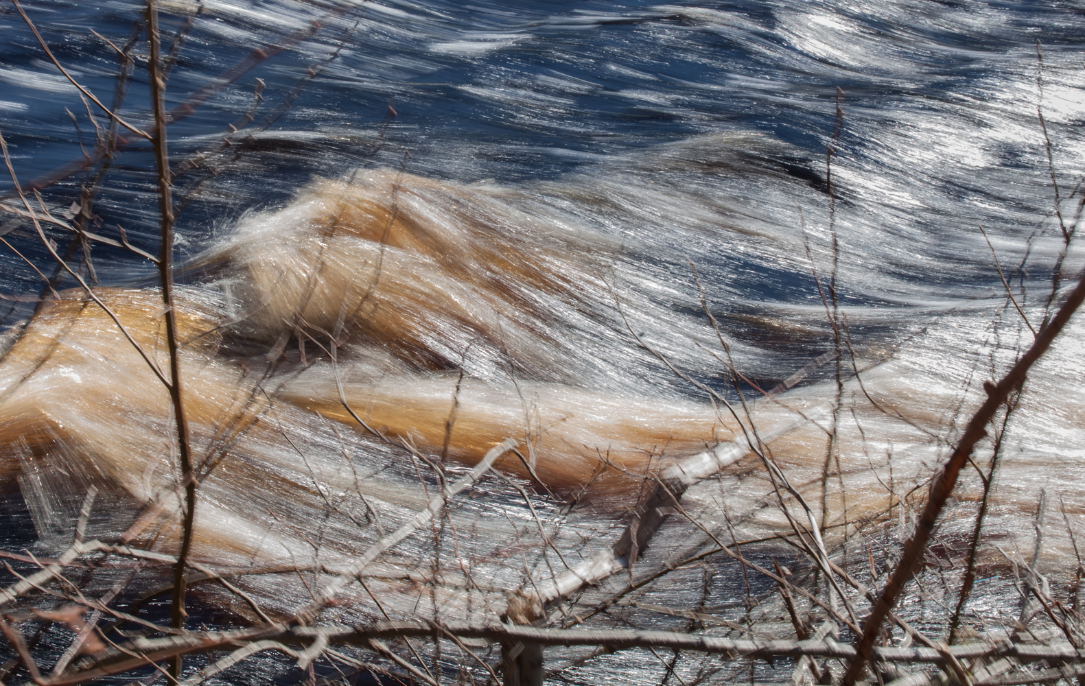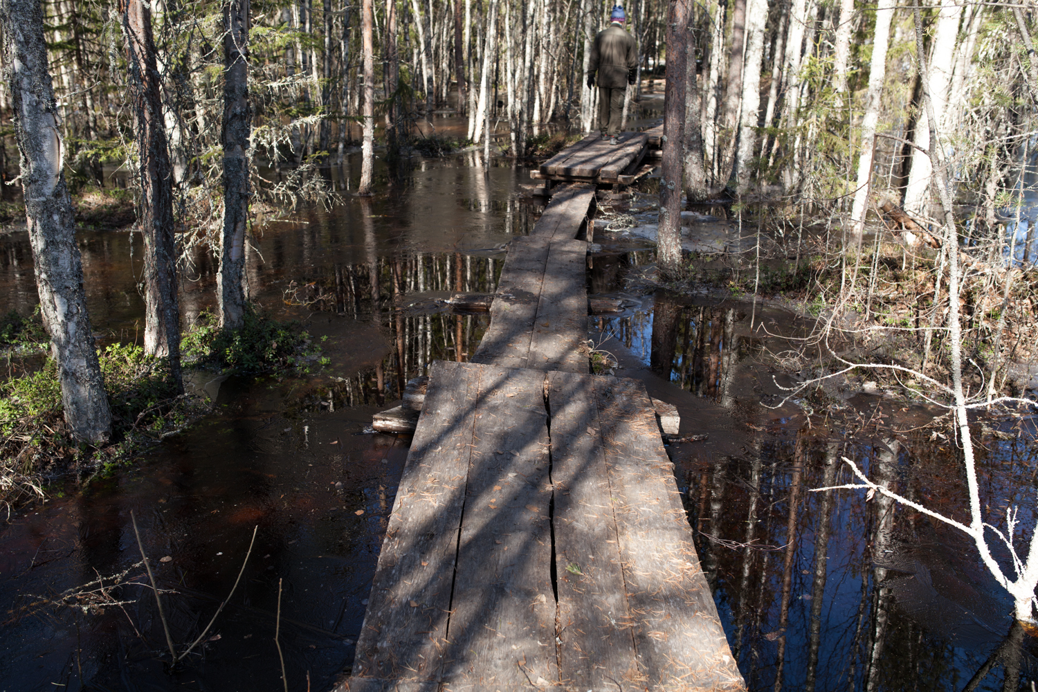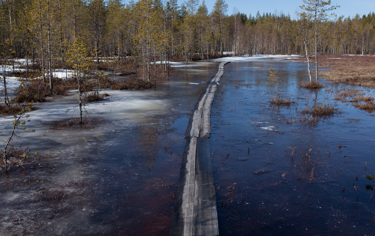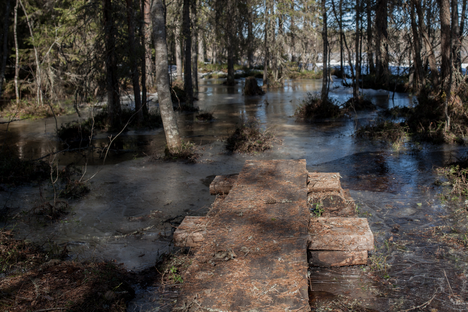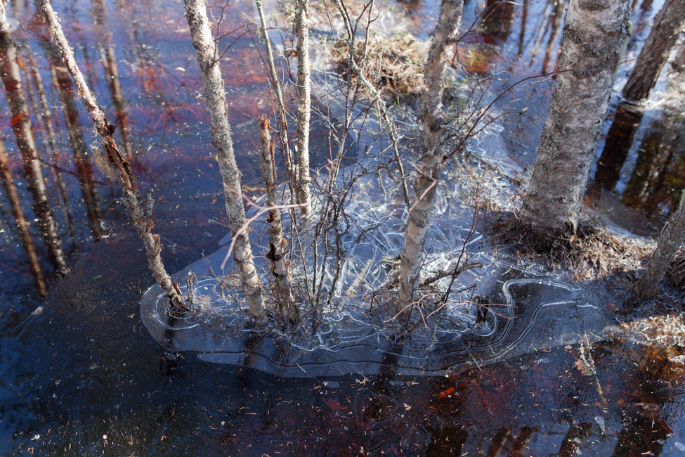 Pitkospuilla kävellessä ympärillä oleva ohut jää ritisi. Ei sopinut horjahtaa.