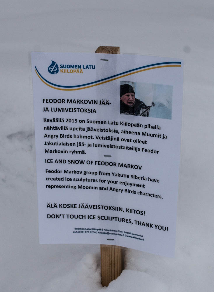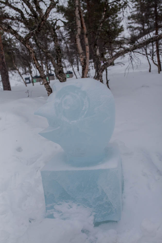 Ensin käytiin Kiilopään juurella katsomassa jääveistoksia, jotka eivät oikein päässeet oikeuksiinsa pienessä pyryssä.
