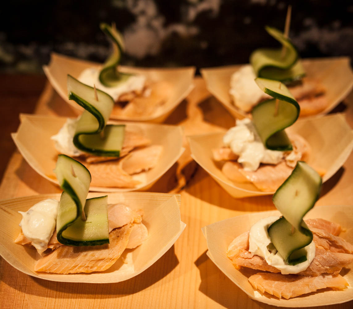 Lapakset olivat kauniita, ja pikkukipoissa uusi sovellus: avokadoa (sitruunamehulla muhennettuna) ja poron kylmäsavuhakkelusta ja koristeeksi muutama siivu. Hyvä yhdistelmä oli. Sitten tavallista savupororieskaa juustokukilla ja ”uusia” rautuveneitä.