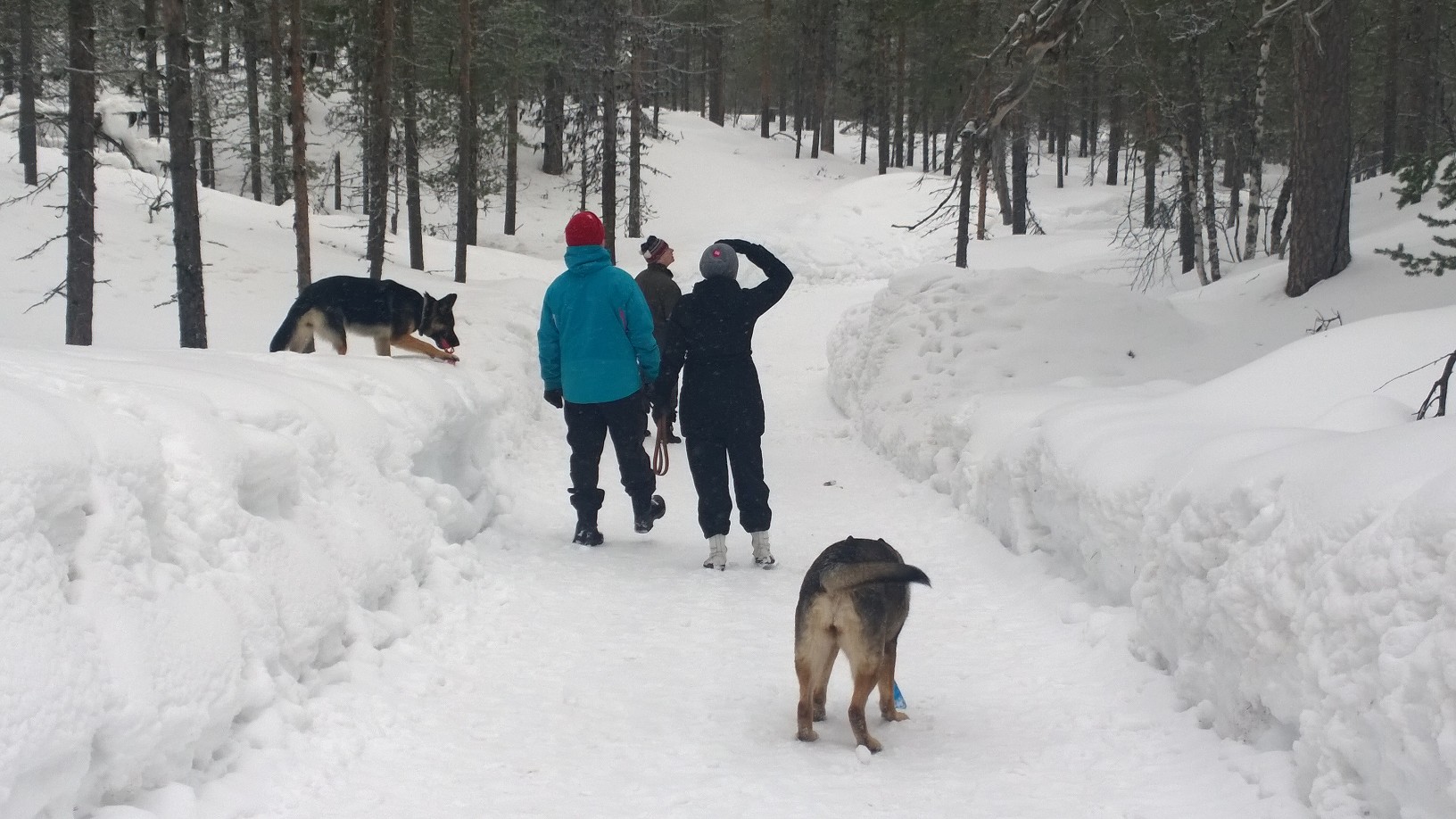 Eihän meitä aurinko tänään(kään) ilahduttanut, mutta pilvinen, ajoittain sateinen sää ei ollut este liikkumiselle. Minäkin jätin tänään hiihtämättä, lähdettiin koko porukka ja koirat kävelylenkille.