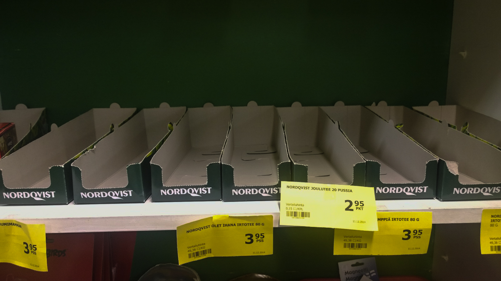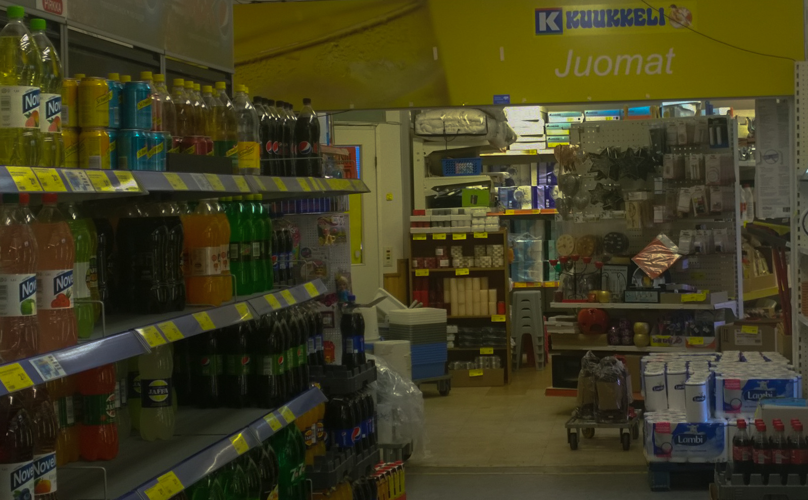 Eikä todellakaan kaikkea ole, useimmiten ei ollenkaan, ja jos on, ne on aika arveluttavasti, ei oikein millään ajatuksella paikoilleen pukuattu: koiranruoat ja Piltit samoilla hyllyillä, juomavarastossa epälukuinen määrä epämääräistä pikku tilpehööriä, juomat sulassa sovussa kukkamultien ja vessapapereiden kanssa, tai suunnilleen sinne päin …