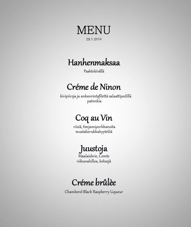 Ennen näitä ilta oli aloitettu samppanjalla ja noiden jälkeen oli illallisen aika: ruokaviineinä oli viinejä Bourgognesta.