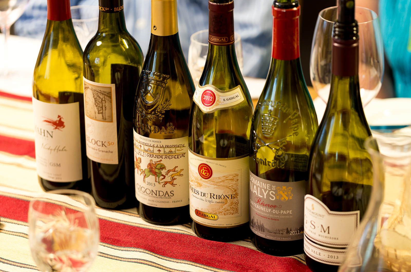 Sokkona maistelimme, emmekä – tietenkään – arvanneeet/tienneet, että teemana oli GSM (= grenache, syrah, merlot). Hieman sellaista arvailimme, mutta emme tiennneet ennen kuin pullojen etiketit paljastettiin.