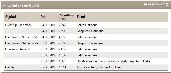 Tuostahan voisi kirjoittaa pienen novellin. Tuo tiistaina 3.5. klo 1:47 kirjattu ”Hätätilanne tai huono sää on viivästyttänyt toimitusta” kiinnostaa. Minulla on siihen jo monta juonenkäännettä mielessä. Eindhovenissa Hollannissa sattui kerran yksi pienen linja-automatkaseurueemme kriisitilanne: onko venenäyttely vai yöunet tärkeämpi juttu? Siitäkin voisi kirjoittaa. Nyt Salomon-tilaukseni kohdalla hieman huolettaa, että Glostrupin jälkeen popoistani ei ole kuulunut mitään. Jäivätkö ne Juutinrauman tulliin? Tanskan salmien yli eivät ole vielä tulleet, vaikka jo kaksi vuorokautta ovat olleet melkein rannalla? Mitä on tapahtunut?