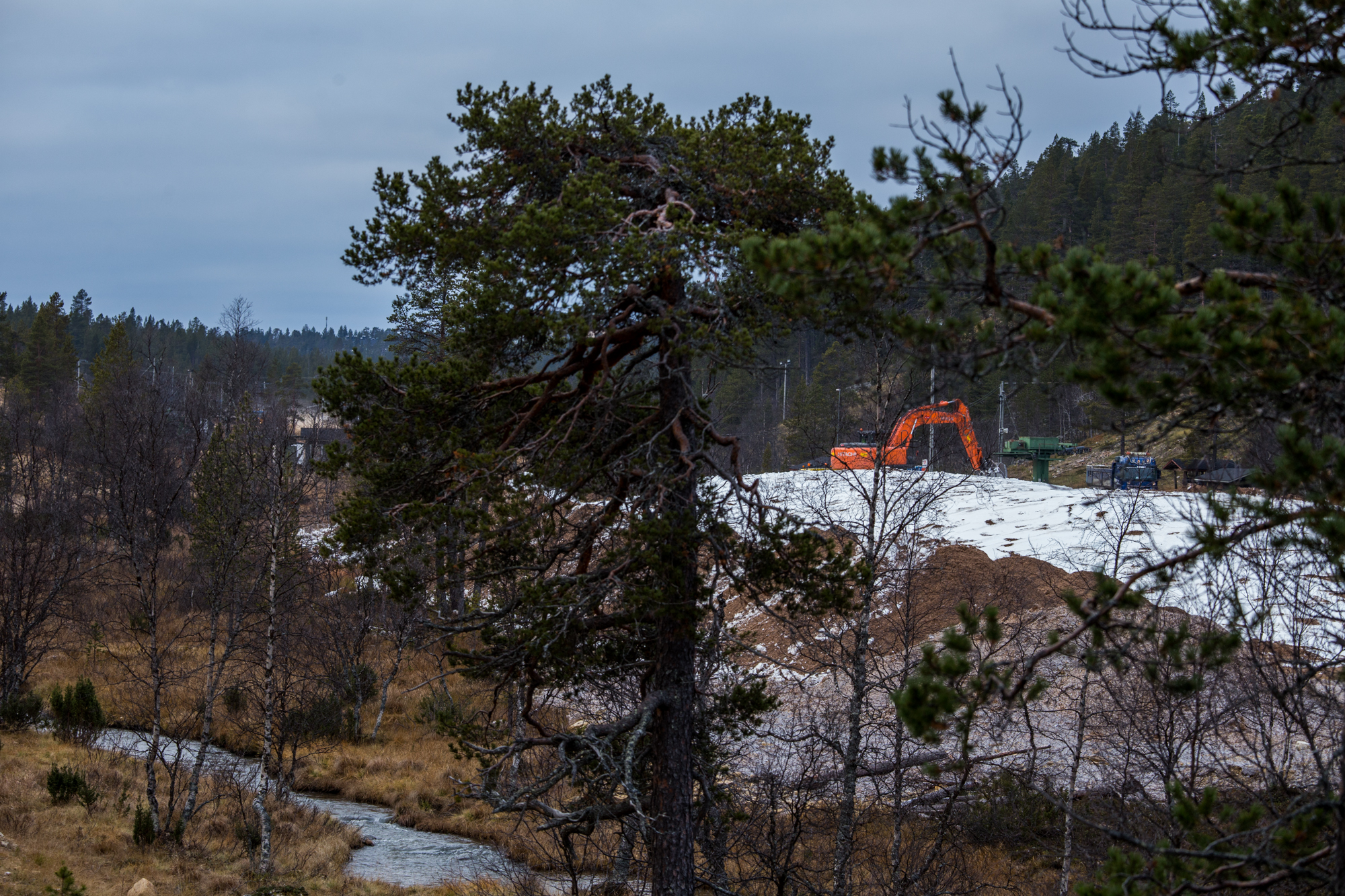 Ehkä kannattaisi kertoa siitä, että täällä ei ole satanut lunta, kuten kai suunnilleen kaikkialla muualla maassa on. Aika kylmä (- 2 C) lenkillä sittenkin oli; täällä kuitenkin jo lähtöoletuksena on pukeutua kunnolla, joten emme paleltuneet. Luttojokivartta kävelimme, vuorotellen rattaita pukkaillen, kohti Palo-ojan siltaa. Olisi ollut mahdollisuus lähteä kapuamaan kohti Kaunispään huippua, mutta päätimme palata samaa reittiä takaisin. Ihan vain senkin takia, että reitin varrella oli lumensäilöntäpaikka, josta juuri isolla kaivurilla lastattiin kuorkkureiden lavalle lunta (ensilumen latua tehdään vauhdilla, – enemmän, vähemmän keinotekoisesti) ja tuommoinen touhuhan on parasta, mitä Aapeli voi patikkareitin varrella nähdä.