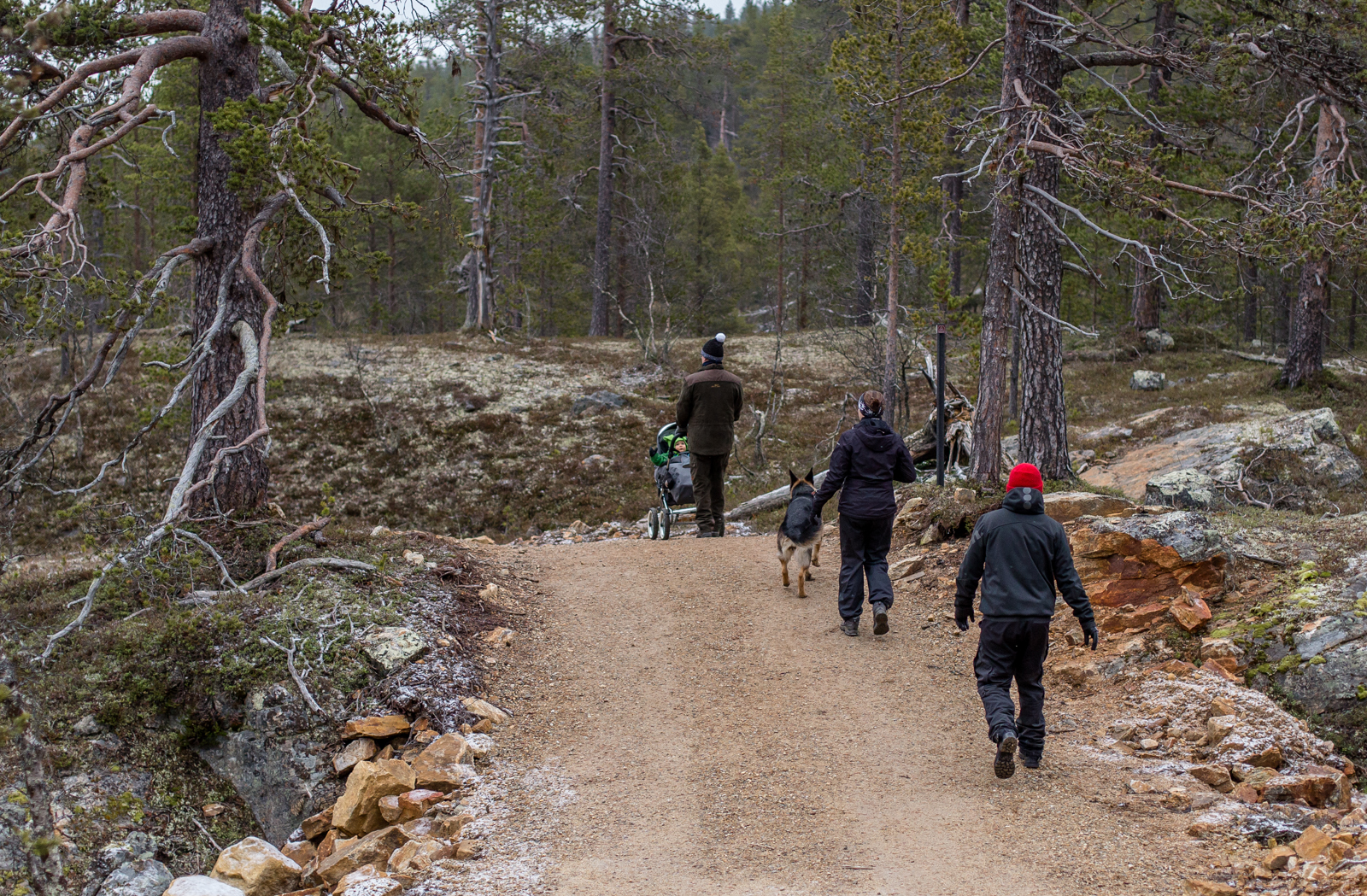 Vähän erilainen patikka tänään. Emmaljunga-ystävällinen reitti oli löydettävä. Kyllä meinasi minua naurattaa tämän jonon kannoilla kulkiessani. Arvaattekos, mikä Lapin tunturien kupeissa, kurujen kyljissä Apsua eniten hämmästytti? – Orava? Isosti soliseva tunturipuro? Muutamat satunnaiset lumihiutaleet? Isot korkealle nousevat kelot? Mikä hämmästytti? Mikä sai pojanpojan katseen nauliintumaan näin?