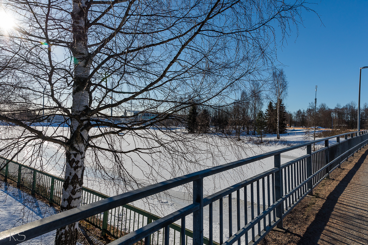 Aamun pakkaskelissä hammaslääkäriin kävellessä oli hirmu hieno auringonpaiste, joten eihän se kamera repussa pysynyt, vaan välillä oli pysähdeltävä kuvailemaan.