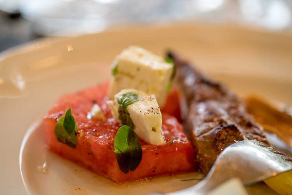 Paloittele vesimeloni, kuori, valele oliiviöljyllä, hunajalla, ripaus pippuria ja suolaa ja pikainen grillissä käyttäminen. Ohessa oli (paitsi lampaansisäfilettä etc.) uunifetaa oreganon kanssa.