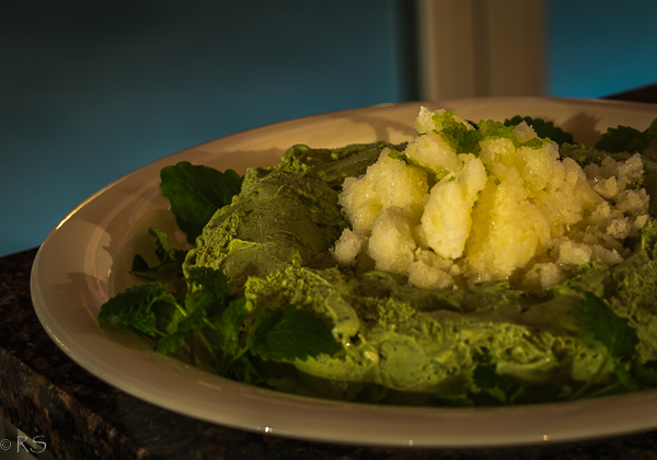 Eilen jälkkärinä oli matcha-(vihreä tee)jätskiä, ja sen keskelle laitoin päärynäsorbettia, jolla koko illallisen myös aloittelimme.