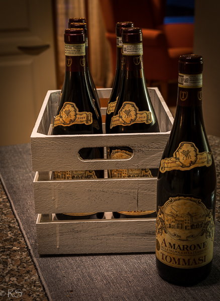 Tommasin sixpack-tasting eli kuusi eri vuosikertaa samaa viiniä (Tommasi Amarone della Valpolicella, yksi minun lempiviineistäni!), vanhin vuosikertaa 2007 ja nuorin 2012. Ehkä näille muutaman vuoden lisäkellarointi olisi tehnyt vielä hyvää, mutta kyllä olivat jo vähän ehtineet kypsyä.