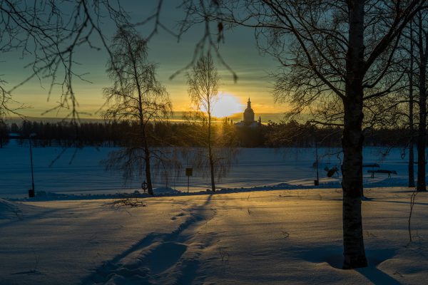 Aamuaurinko Alatornion kirkon takana lupaa kevättä.