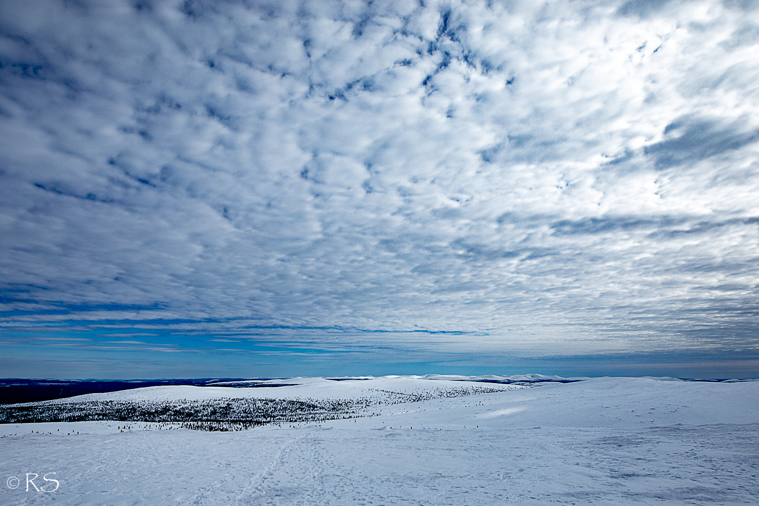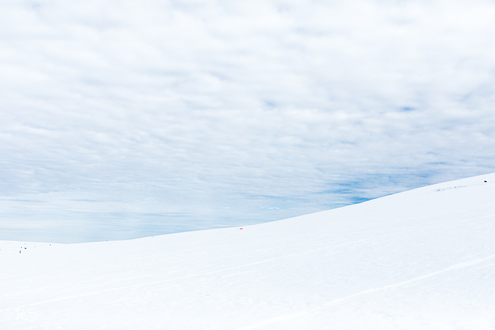 Enimmäkseen kuvat valkoista valkoisella. Hanki, jota riittää, on valkoista, ja taivas pilvessä aika lailla valkoinen.