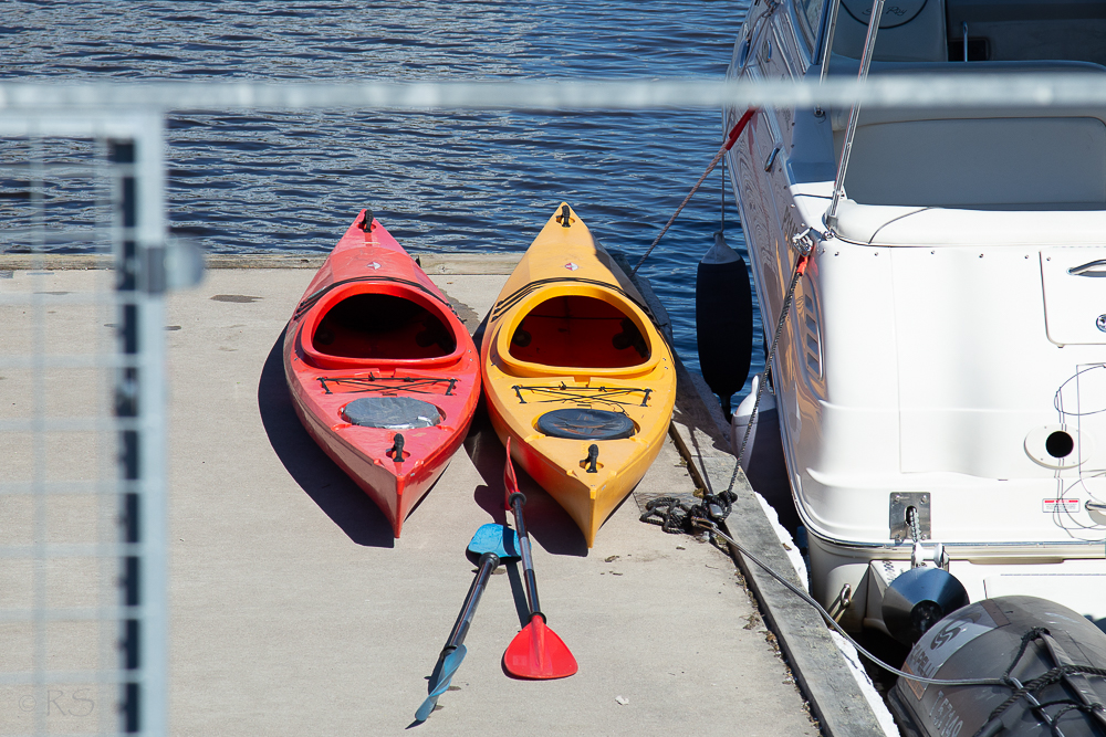 Puolenpäivän jälkeen lähdettiin sitten Pehtoorin kanssa minun triathlon-päiväni toiselle osuudelle eli pyöräilemään. Lämmintä jo yli +30 C ja vastatuuli. Mutta vain kaupunkiin ja torinrantaan asti poljettiin. Ja vuokrattiin kanootit! Olen monena kesänä puhunut että haluaisin kokeilla ja aina se on jäänyt. Olen kerran elämässäni melonut Kitisellä. Yhden sporttisen ystäväni 50-vuotispäivän ohjelmassa oli halukkailla mahdollisuus pari, kolme tuntiseen melontaan kaksoiskajakilla (tms.) ja minä työkavein parina meloin. Taidettiin tulla toiseksi kilpailussa, jossa oli kuitenkin viisi vai kuusi paria. Silloin olinkin kyllä huippukunnossa muutenkin. Ja pari kesää sitten Kukkolankoskella melottiin kumiveneillä ryhmässä koski alas, mutta se ei oikein ole verrattavissa tähän.